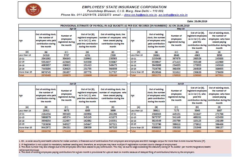 PROVISIONAL ESTIMATE OF PAYROLL IN AGE BUCKETS AS PER ESIC RECORDS (IN NUMBERS)- AS ON 20.08.2019 size:(112.44 KB)
